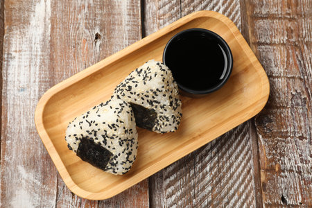 Rice balls (onigiri) and soy sauce on wooden table, top view. Traditional Japanese dish