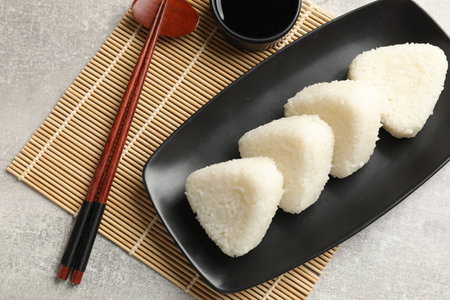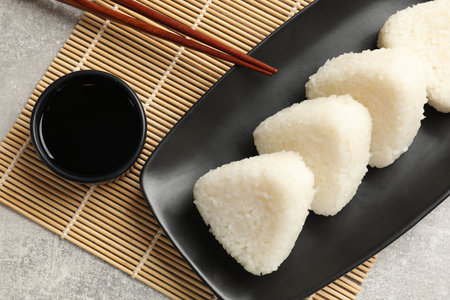 Tasty onigiri (Japanese rice balls) served on grey table, top view
