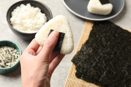 Woman with tasty onigiri (Japanese rice ball) at light table, closeup