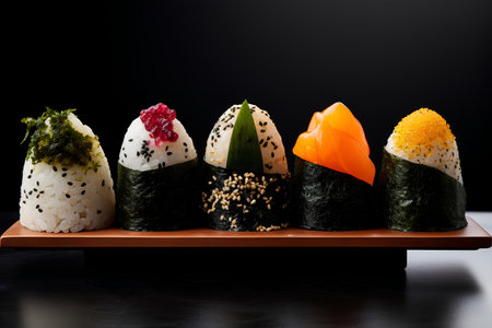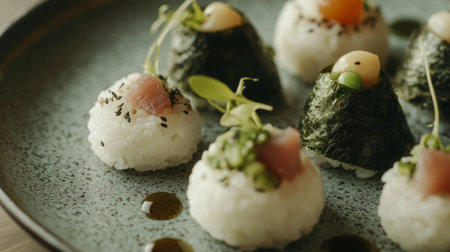 A beautifully presented plate of rice balls with colorful fillings, set against a rustic wooden background, with soft lighting bringing out the textures