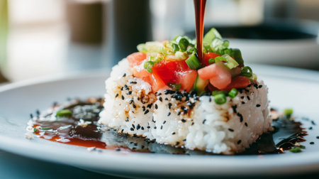 A beautifully crafted sushi stack featuring crispy chicken, rice, and fresh vegetables drizzled with a rich sauce, perfect for food lovers and culinary enthusiasts.