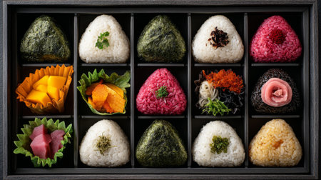 A stunning assortment of Japanese onigiri rice balls presented in a wooden tray, featuring various colors and fillings, perfect for food lovers and culinary enthusiasts.