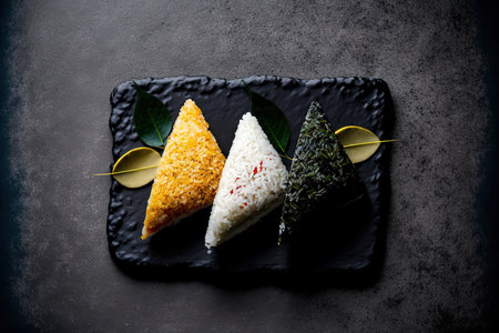 Triangle shaped sushi rice balls on a slate dish