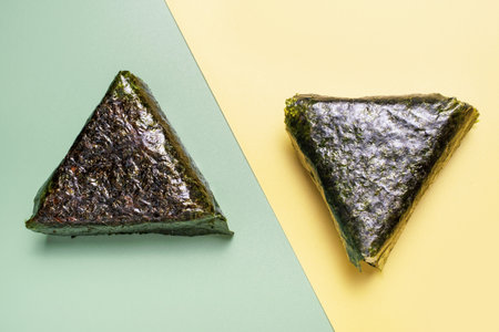 Two triangles of nori with rice on a green and yellow background, close-up, top view