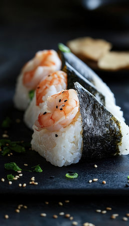 Sushi with shrimps and sesame seeds on a black background