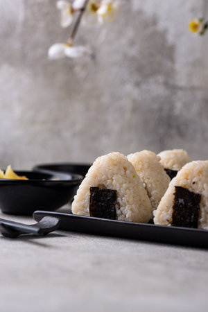 Traditional Japanese onigiri on gray background