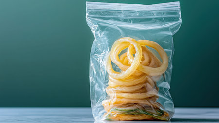 A clear bag containing fresh onion rings sits against a smooth green background. This photo highlights the healthy snack and cooking ingredient.