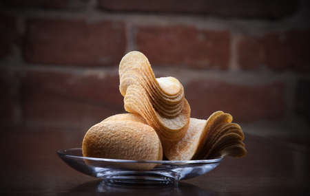 Delicious potato chips on dark background, on wooden background, Junk food, fast snack, crisps
