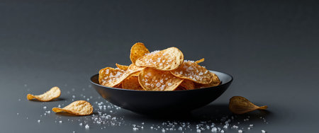 AI Generated. Crispy potato chips in black bowl with coarse salt on dark background