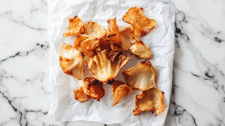 Beautifully arranged dried flower petals resting on crumpled white paper, capturing the essence of nature's simplicity and organic beauty on a marble surface.
