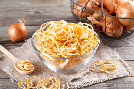 Dried onion rings in a glass bowl on a wooden table. Spices and food ingredients