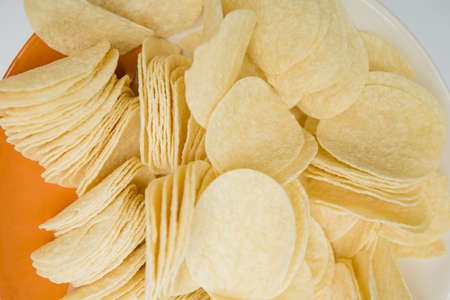 crisps Crispy potatoes. Potato chips on an orange background. Close up.
