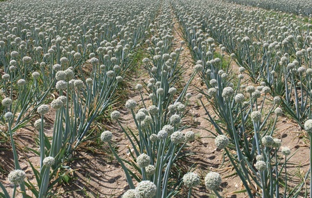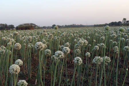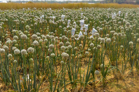 white colored onion flower on firm for harvest