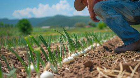 A young farmer farming onions. Field landscape from the back. Generated by artificial intelligence.