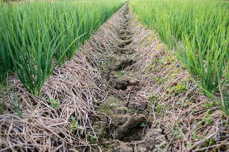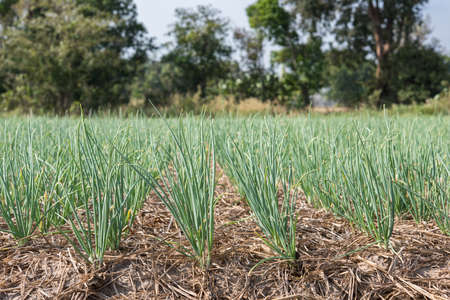 Green shallot growth in farmland(Allium ascalonicum),vegetable garden farmland in Northeast of Thailand.