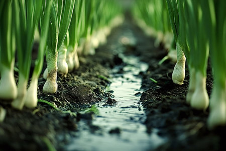 Water flows between rows of vibrant green onions growing in rich, dark soil, showing sustainable agriculture and healthy food production