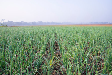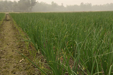 Green Onion plantation in the field of foggy winter morning view