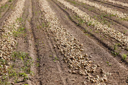 agricultural field where harvesting and onions, close up