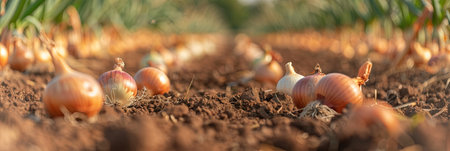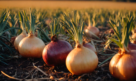 Red onions grow in rich soil, illuminated by golden light at sunset. Lush green tops reach upward, creating a vibrant contrast with the earthy surroundings, showing a bountiful harvest.