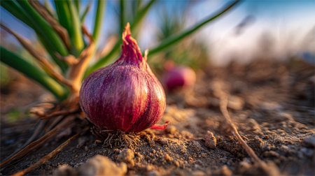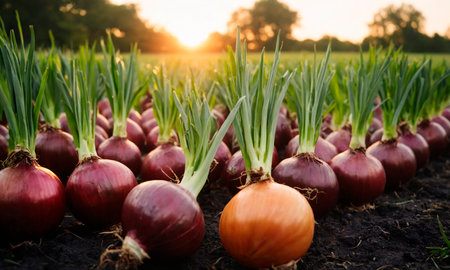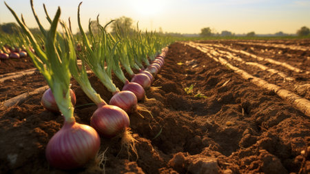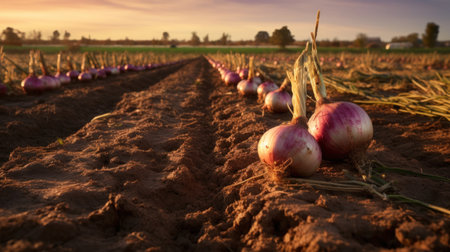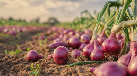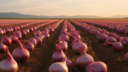 photorealistic red onion field