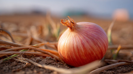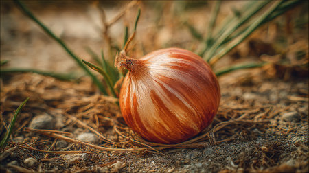 Onion on the ground. Selective focus. Shallow depth of field.