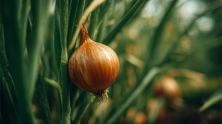 Onion in the garden. Selective focus. Shallow depth of field.