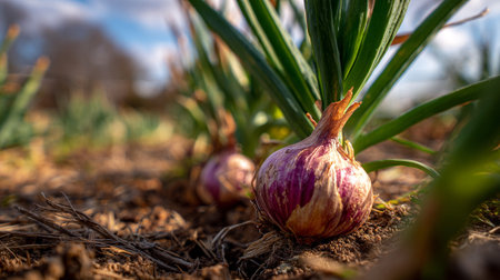 A close-up view of freshly harvested red onions lying in rich soil, showcasing the beauty of organic farming and the richness of earth's produce.