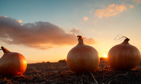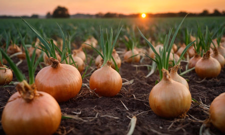A field of freshly harvested onions is illuminated by the warm glow of the setting sun.