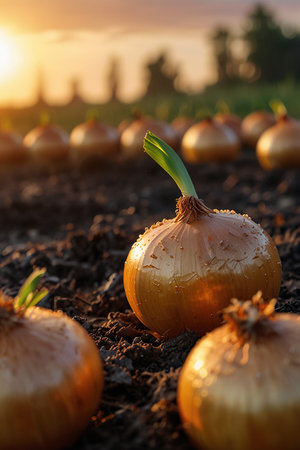 Onions on the field. Selective focus. Shallow depth of field.