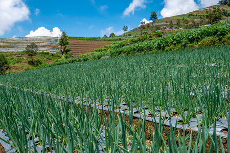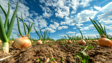 A breathtaking scene of vibrant green onions thrives under a brilliant blue sky dotted with fluffy white clouds Captured in the soft, golden light of a fresh morning, this photograph embodies the essence of perfect agriculture, showcasing the beauty and bounty of nature AI Generative