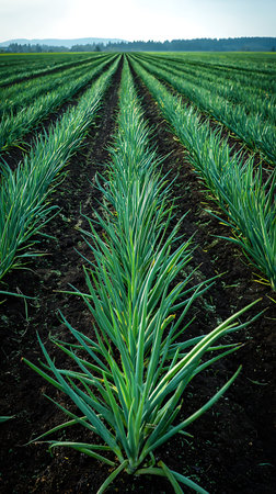 Lush green onion plants grow in organized rows, showcasing the rich soil and agricultural landscape under a cloudy sky, highlighting organic farming methods.