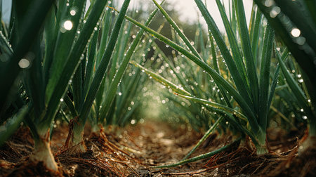 A panoramic wide view of Onion field growing closely together in a dewy morning shining droplets on leaves warm soft daylight ultra realistic photography cinematic wide composition lifelike natural scene