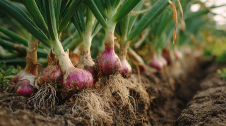 Vibrant red onions freshly harvested, nestled in rich soil with visible roots. This image captures the essence of healthy agriculture and sustainable farming practices.