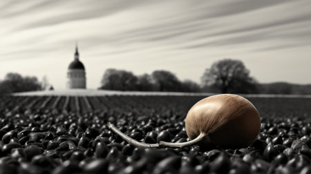 a green apple rests on the grass, contrasting against the sepia-toned backdrop of an old church. this national geographic photo captures the essence of a french landscape, reminiscent of the black and white grayscale style. inspired by yayoi kusama and spencer tunick, the photo was taken with provia film, adding a touch of vintage charm to the composition. ai generated