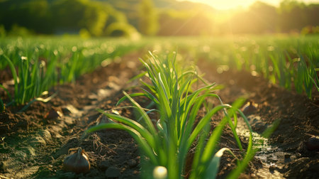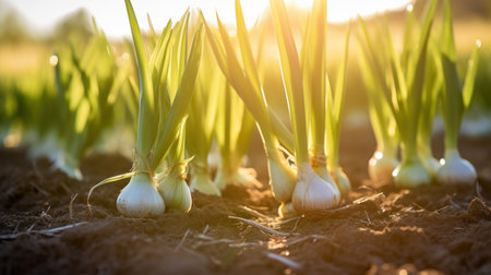 Generative AI : Onion plants growing in the vegetable garden
