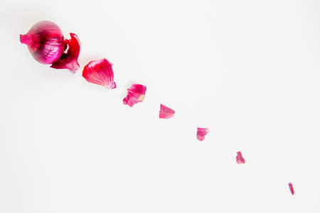 Whole Red onion Sliced in different ways and arranging. Top view Garnish and food ingredients on isolated white background.