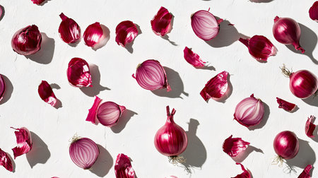 A vibrant composition of fresh red onions, both whole and sliced, showcasing their rich colors and textures, ideal for culinary use or food photography.