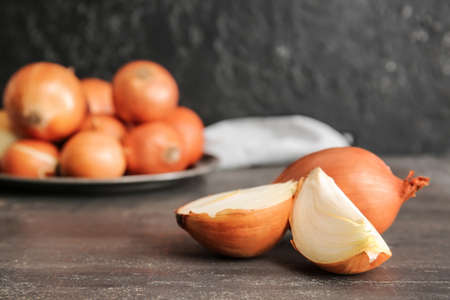 Peeled and unpeeled fresh onions on a wooden table. Autumn harvest.