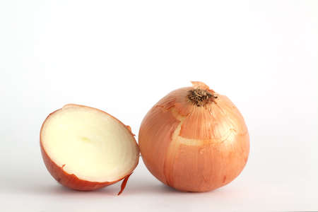 Red onion cut in half on a white background