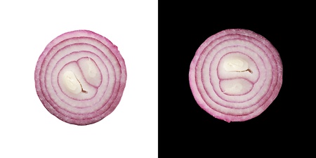 Red onion cut in half on a white background