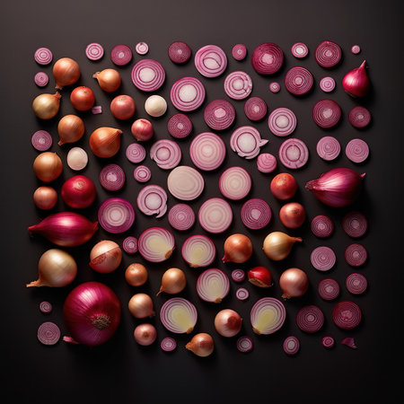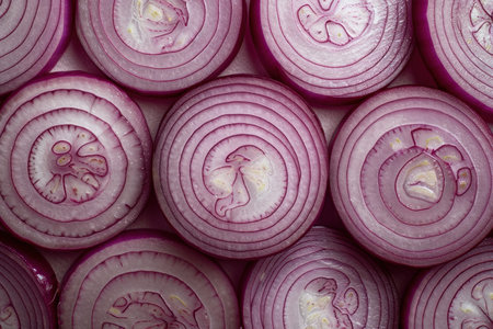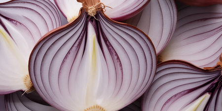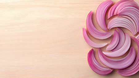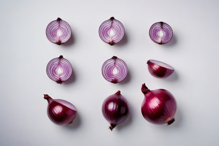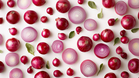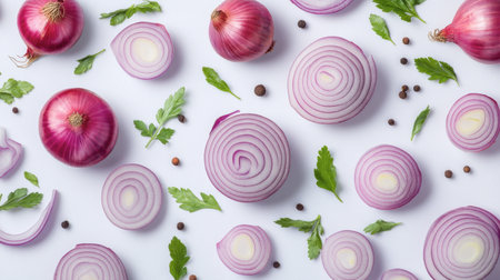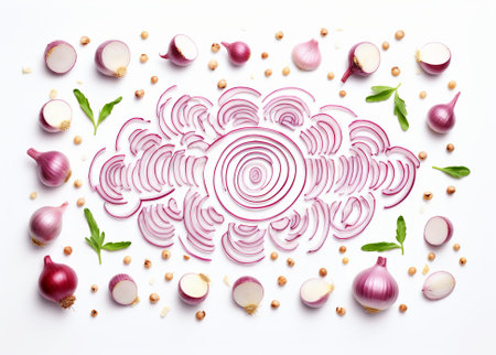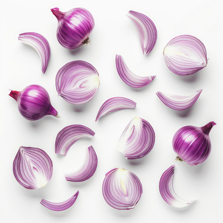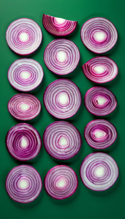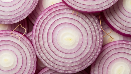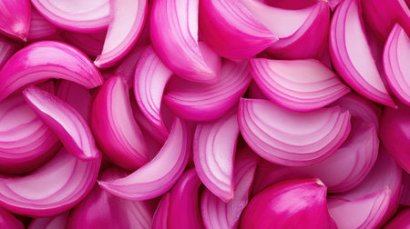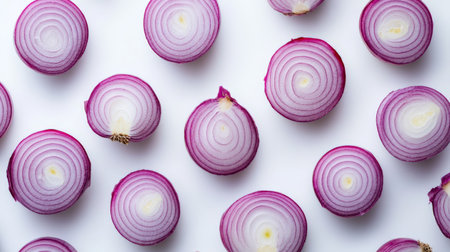 A visually striking arrangement of sliced red onions showcases their vibrant color and texture, perfect for food art or culinary presentations on a clean background.