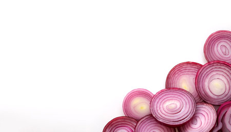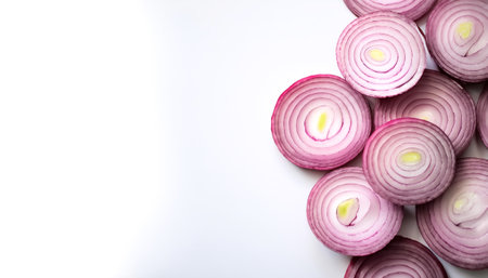 Sliced red onions arranged on white background with space for text, showcasing fresh raw vegetable ingredients for healthy food and cooking.