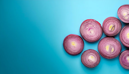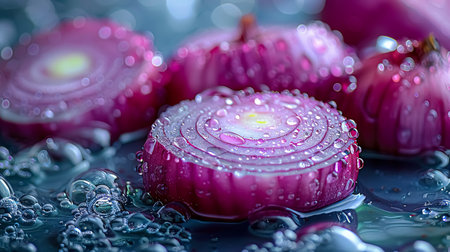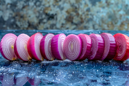 Fresh Sliced Red Onions Lined Up on a Blue Textured Surface with Dew Drops AI Generative