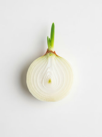 A close-up, top view of a freshly cut white onion on a clean, white background, showcasing its layers and green shoot. Ideal for healthy food, cooking, and minimalist still life photography.