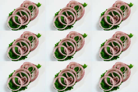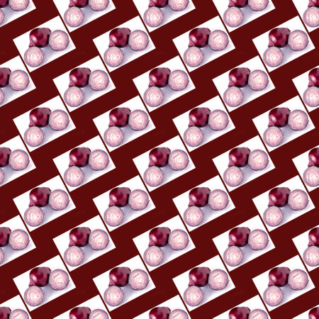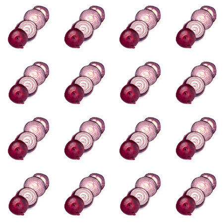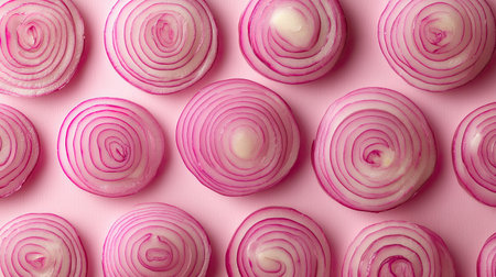 An isolated pattern of sliced pink onions, artistically arranged in a frame,