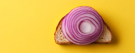 Slice of red onion on toast against a vibrant yellow background, minimalistic food photography concept