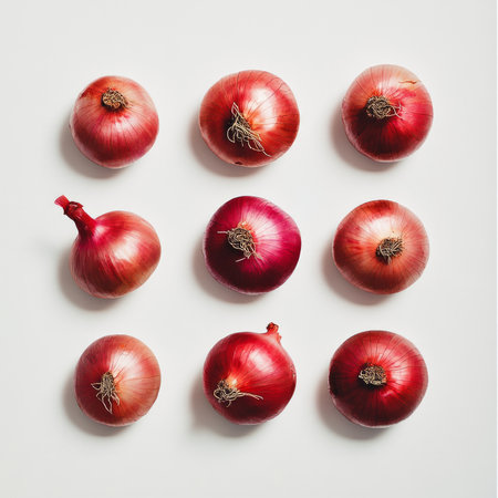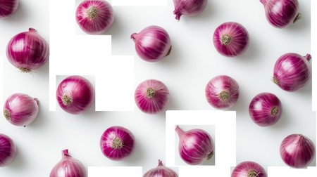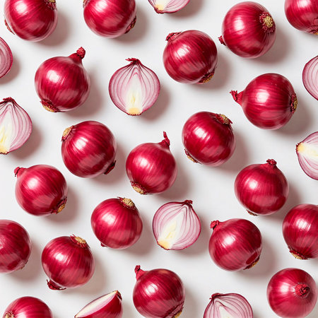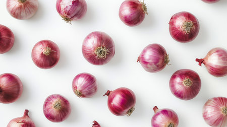 Top view arrangement of fresh red onions on white background.