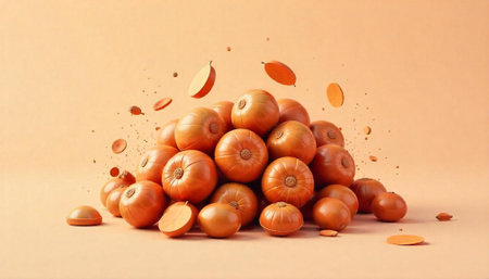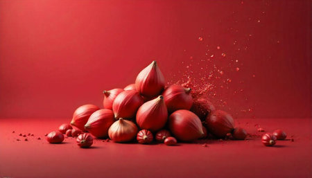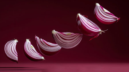 Symphony of red onion slices floating gracefully against a rich crimson backdrop. Experience the abstract charm and vibrant elegance. Generated A.I.