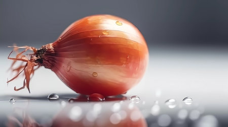 Onion with water drops on a reflective surface. close-up.