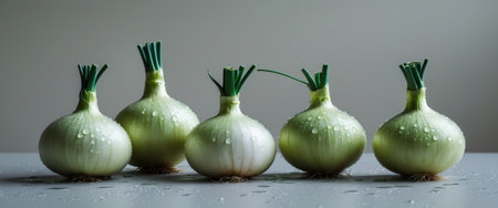 AI Generated. Onion bulbs with green tops and water droplets